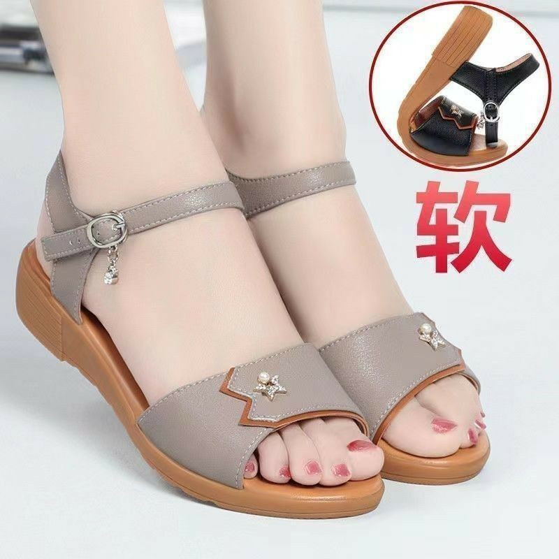 Nouvelles sandales polyvalentes à la mode pour mères d'âge moyen et âgées sandales antidérapantes à fond souple en cuir souple sandales compensées latérales souples pour femmes
